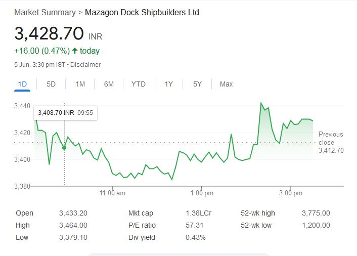 - मझगांव डॉक का शेयर 5 जून को 0.47% बढ़कर 3428.70 रुपये पर ट्रेड कर रहा है।