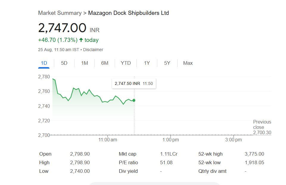 बीएसई पर मझगांव डॉक का शेयर 2798.90 रुपये के स्तर पर खुला और दिन में यही इसका इंट्रा-डे हाई भी रहा। हालांकि इसके बाद थोड़ी गिरावट देखी गई। पिछले एक साल में कंपनी के शेयर में 27.50% की बढ़त देखी गई है, जबकि तीन सालों में इसने 1649% का शानदार रिटर्न दिया है। कंपनी का मार्केट कैप अब 1.11 लाख करोड़ रुपये तक पहुंच गया है। इसका 52 सप्ताह का हाई 3775 रुपये और लो 1918.05 रुपये है।