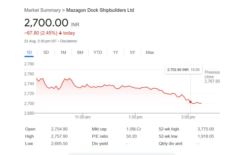 शुक्रवार, 22 अगस्त 2025 को मझगांव डॉक शिपबिल्डर्स लिमिटेड कंपनी के शेयर में -2.45% की गिरावट आई और यह शेयर 2700 रुपये पर बंद हुआ था। शुक्रवार को सुबह ओपनिंग बेल पर ट्रेडिंग शुरू होते ही मझगांव डॉक शिपबिल्डर्स कंपनी शेयर 2754.90 रुपये पर ओपन हुआ था। जो शुक्रवार दोपहर 3.30 बजे तक मझगांव डॉक शिपबिल्डर्स कंपनी शेयर 2757.90 रुपये के इंट्रा-डे हाई लेवल तक पहुंच गया था। वहीं, इस शेयर का लो लेवल 2695.50 रुपये था।