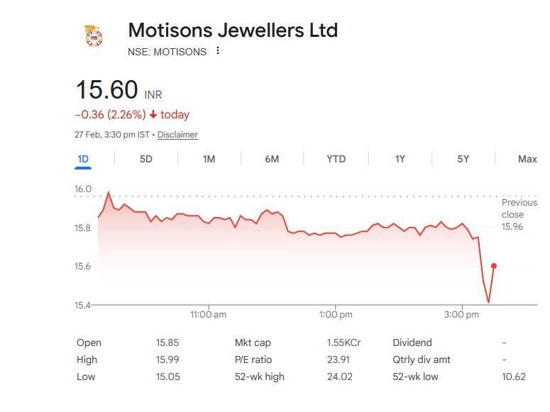 हालांकि, वर्तमान में Motisons Jewellers के शेयरों में गिरावट देखने को मिली है। बीएसई में शुक्रवार को शेयर 15.85 रुपये के स्तर पर खुले, लेकिन मार्केट क्लोजिंग तक इसमें 2.26% की गिरावट आई और यह 15.60 रुपये पर आ गया। बीते 6 महीनों में इन शेयरों में 20% की गिरावट आई है, जबकि एक साल में 14% की गिरावट देखने को मिली है।