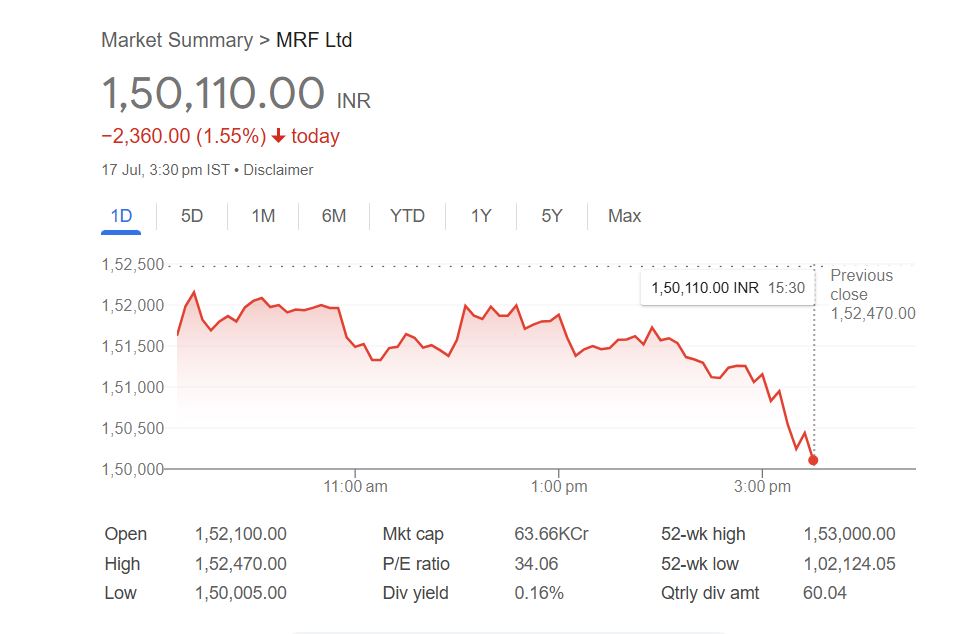 जून 2023 में MRF ने 1 लाख रुपये का आंकड़ा पार किया था और यह मुकाम हासिल करने वाली देश की पहली कंपनी बनी थी। तब से यह लगातार उस लेवल से ऊपर कारोबार करता आ रहा है। बीते कारोबारी सत्र में इसने 1,53,000 रुपये का ऑल टाइम हाई को भी छू लिया है। खास बात यह है कि 1996 में लिस्ट होने के बाद से कंपनी ने ना तो कोई बोनस दिया है, ना ही स्टॉक स्प्लिट किया है, फिर भी इसका प्रदर्शन जबरदस्त रहा है।