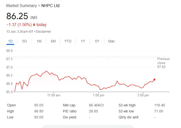 NHPC Share Price: सप्ताह के अंतिम कारोबारी दिन शुक्रवार, 13 जून 2025 को ट्रेडिंग के दौरान NHPC लिमिटेड के शेयरों में गिरावट देखी गई। दोपहर तक यह स्टॉक 1.56% की गिरावट के साथ 86.25 रुपये पर ट्रेड कर रहा था। ट्रेडिंग की शुरुआत आज सुबह 85.05 रुपये पर हुई थी, जबकि दिन का उच्चतम स्तर 86.80 रुपये और न्यूनतम स्तर 85.05 रुपये रहा।
