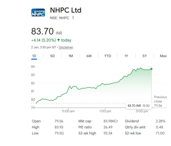NHPC Share Price: NHPC लिमिटेड के शेयर ने 2 जनवरी 2026 को इंट्राडे में जबरदस्त तेजी दिखाते हुए 5.49% बढ़ोतरी के साथ 83.93 रुपये के दिन के उच्चतम स्तर को छुआ। यह प्रदर्शन पावर सेक्टर और सेंसेक्स से बेहतर रहा और ट्रेडिंग में उत्साह बढ़ाया।