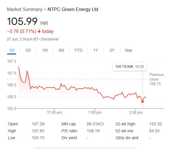 शुक्रवार, 27 जून 2025 को NTPC ग्रीन एनर्जी का शेयर 0.71% गिरकर 105.99 रुपये पर बंद हुआ था। बीते एक महीने में शेयर में करीब 6.06% की नरमी देखी गई है। कंपनी का 52-हफ्ते का उच्चतम स्तर 155.35 रुपये रहा है, जिससे अब यह लगभग 32% नीचे कारोबार कर रहा है। गौरतलब है कि NTPC ग्रीन के शेयर नवंबर 2024 में 108 रुपये के इश्यू प्राइस पर सूचीबद्ध हुए थे।