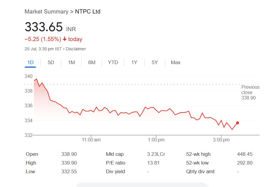 - NTPC शेयर 1.55% गिरकर ₹333.65 पर बंद