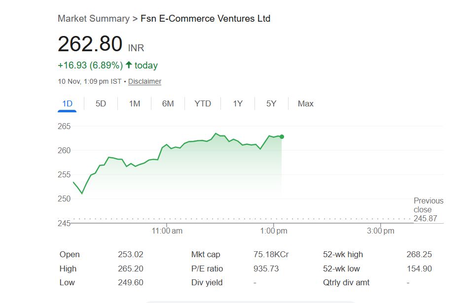 Nykaa Share Price: ब्यूटी और फैशन ई-टेलर नायका (Nykaa) की पेरेंट कंपनी FSN ई-कॉमर्स वेंचर्स लिमिटेड के शेयर आज सोमवार को निवेशकों के फोकस में रहे। कारोबार के दौरान शेयर में 7% तक की तेजी आई और यह 262.80 रुपये पर पहुंच गया। इस उछाल के पीछे सितंबर तिमाही के शानदार नतीजे मुख्य कारण माने जा रहे हैं।
