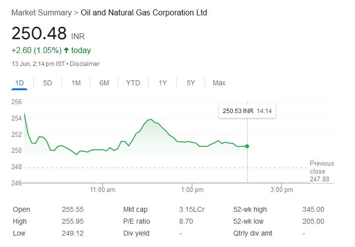 आज शेयर बाजार में नकारात्मक माहौल के बावजूद ऑयल एंड नेचुरल गैस कॉर्पोरेशन लिमिटेड (ONGC) का स्टॉक हल्की बढ़त के साथ ट्रेड करता नजर आया। दोपहर करीब 2:14 बजे ONGC का शेयर 1.05% की तेजी के साथ 250.48 रुपये पर कारोबार कर रहा था। शुक्रवार को बाजार खुलते ही यह शेयर 255.55 रुपये पर ओपन हुआ था और दिन में अब तक 255.95 रुपये के उच्चतम स्तर तक पहुंच गया। वहीं, इसका न्यूनतम स्तर 249.12 रुपये दर्ज किया गया।