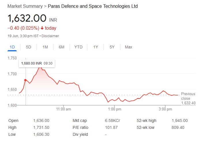 Paras Defence Share: गुरुवार, 19 जून 2025 को घरेलू शेयर बाजारों की शुरुआत नकारात्मक माहौल में हुई। अंतर्राष्ट्रीय बाजारों से मिले-जुले संकेतों के बीच बीएसई सेंसेक्स 82.79 अंक या 0.10% फिसलकर 81,361.87 पर पहुंच गया। वहीं, एनएसई निफ्टी 18.80 अंक यानी 0.08% लुढ़ककर 24,993.25 पर पहुंचा। शुरुआती कारोबारी सत्र में निवेशकों का रुख सतर्क देखने को मिला।