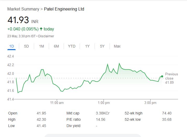 Patel Engineering Share Price: शुक्रवार, 23 मई 2025 को पटेल इंजीनियरिंग लिमिटेड के शेयर में मामूली सी तेजी देखने को मिली। दिन के आखिरी में यह स्टॉक 0.095% की बढ़त के साथ 41.93 रुपये पर बंद हुआ। शेयर ने ट्रेडिंग की शुरुआत 41.95 रुपये से की और दिन में 42.30 रुपये के उच्चतम स्तर तक गया। इस दौरान इसका सबसे निचला स्तर 41.45 रुपये रहा।