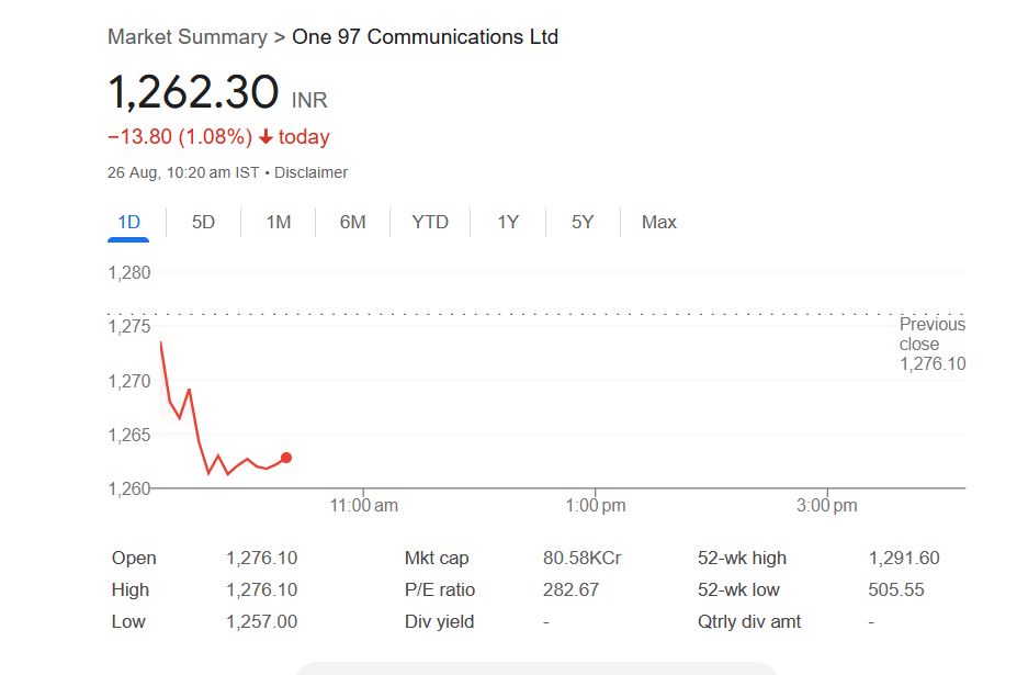 मंगलवार 26 अगस्त 2025 को सुबह 10:20 बजे तक पेटीएम के शेयर 1.08% की गिरावट के साथ 1262.30 रुपये पर ट्रेड कर रहे थे। पिछले साल इसी दिन यह 505.25 रुपये के निचले स्तर पर था। एक साल में यह 155.51% बढ़कर 1291.60 रुपये के हाई तक पहुंच चुका है, जो निवेशकों के भरोसे को और मजबूत करता है।