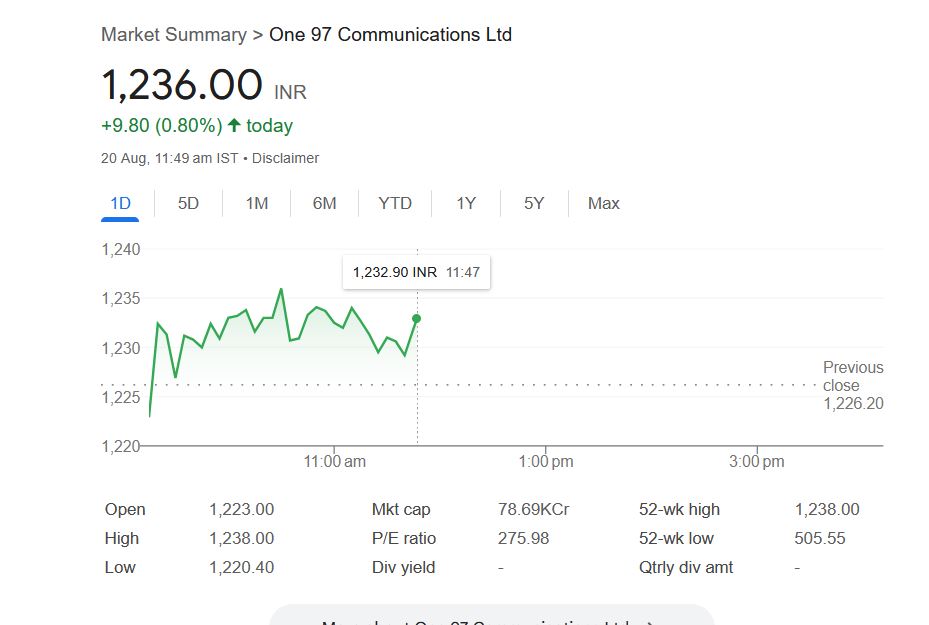 Paytm Share Price: आज बुधवार, 20 अगस्त 2025 को पेटीएम की मूल कंपनी वन 97 कम्युनिकेशंस लिमिटेड के स्टॉक में 0.80% की बढ़ोतरी दर्ज की गई है और यह शेयर 1,236.00 रुपये के स्तर पर पहुंच गया है। यह तेजी उस समय देखने को मिली जब मोतीलाल ओसवाल म्यूचुअल फंड ने कंपनी में अपनी हिस्सेदारी बढ़ाकर 5% से ज्यादा कर दी है।