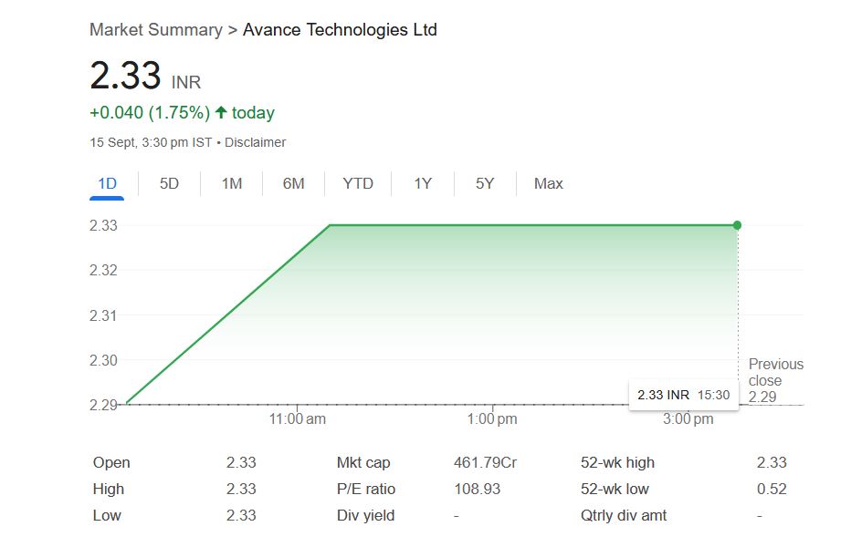 Penny Stock: आज सोमवार, 15 सितंबर को पेनी स्टॉक Avance Technologies के शेयरों में फिर से अपर सर्किट देखने को मिला है। यह लगातार 43वां कारोबारी सत्र है जब कंपनी के शेयरों में अपर सर्किट लगा हुआ है। बीएसई में इस दौरान कंपनी के शेयरों का भाव 2.33 रुपये तक पहुंच गया, जो कंपनी का 52 सप्ताह का उच्चतम स्तर है। कंपनी का 52 सप्ताह का निचला स्तर अप्रैल 2025 में 0.52 रुपये था।