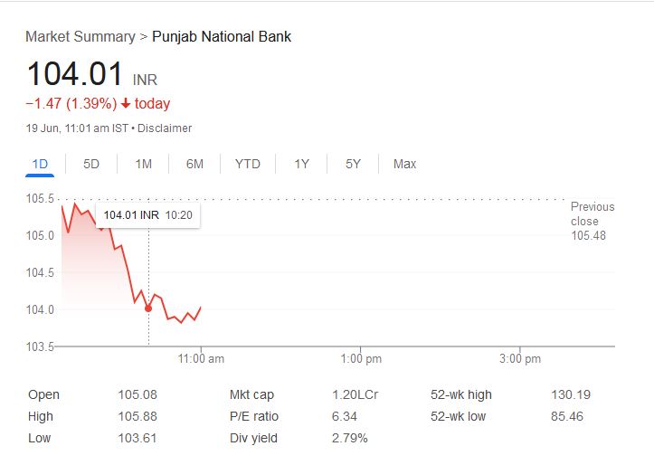PNB के शेयरों ने हाल के हफ्तों में अच्छी रफ्तार पकड़ी थी और कीमत 112.75 रुपये तक पहुंच गई थी, हालांकि बाद में कुछ मुनाफावसूली देखने को मिली और फिलहाल यह 104.01 रुपये पर ट्रेड कर रहा है। डिविडेंड की घोषणा के चलते आज निवेशकों के लिए अंतिम अवसर है इस लाभ को प्राप्त करने के लिए।