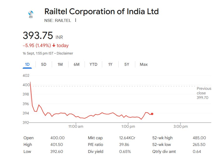 इस बड़े अनुबंध की खबर का असर रेलटेल के शेयरों में भी दिखाई दिया। सोमवार, 15 सितंबर 2025 को रेलटेल के शेयर 8.4% की तेजी के साथ 406 रुपये के उच्चतम स्तर पर पहुंच गए थे। हालांकि, आज मंगलवार 16 सितंबर 2025 को दोपहर 1:55 बजे तक, इसमें 1.49% की गिरावट दर्ज की गई।