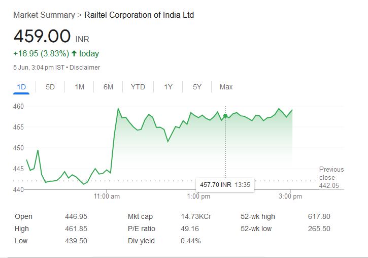 - रेलटेल का शेयर 5 जून को 3.83% उछलकर 459 रुपये पर पहुंचा।
