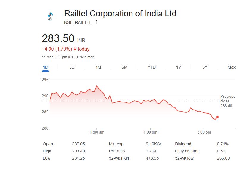 रेलटेल के शेयर बुधवार दोपहर करीब 03:30 बजे 283.50 रुपये पर बंद हुआ, जो कि 1.70% की गिरावट को दर्शाता है। हालांकि, पिछले महीने रेलटेल के शेयरों में 15% से अधिक की गिरावट आई है। रेलटेल के शेयर की गिरावट में बाजार की सामान्य स्थितियों और कुछ रिपोर्ट्स के कारण उतार-चढ़ाव देखा गया।