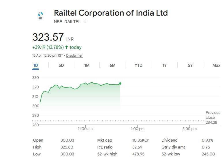 RailTel Share Price: बुधवार 15 अप्रैल को रेलटेल कॉर्पोरेशन ऑफ इंडिया लिमिटेड के शेयर में 14% से ज्यादा की जोरदार बढ़त दर्ज की गई है। यह जुलाई 2024 के बाद एक दिन में आई सबसे बड़ी तेजी मानी जा रही है। निवेशकों की खरीदारी से स्टॉक में मजबूत उछाल देखने को मिला है। (NSE: RAILTEL, BSE: 543265)