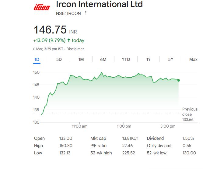 - IRCON का शेयर 13% तक चढ़ा, RVNL का 6.86% बढ़ा।