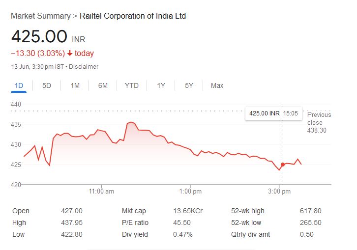 शेयर बाजार में RailTel का प्रदर्शन शानदार रहा है। बीते 3 महीनों में कंपनी के स्टॉक में 50% तक की तेजी देखने को मिली है। इस शेयर का 52-सप्ताह का हाई 617.80 रुपये और लो लेवल 265.50 रुपये है। मौजूदा समय में RailTel का मार्केट कैपिटलाइजेशन 13,650 करोड़ रुपये हो गया है। खास बात यह है कि 2 साल में इस शेयर ने 230% का जबरदस्त रिटर्न दिया है।
