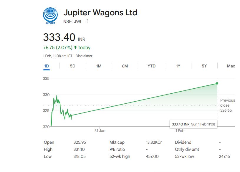 जूपिटर वैगन्स लिमिटेड का शेयर बीएसई में 325.95 रुपये पर खुला। दिनभर के कारोबार में यह 333.40 रुपये तक पहुंच गया, यानी करीब 4% की तेजी दर्ज की गई। पिछले एक हफ्ते में इस रेलवे स्टॉक में लगभग 10% की तेजी देखने को मिली है। विशेषज्ञ मानते हैं कि बजट में रेलवे परियोजनाओं के विस्तार और सरकारी निवेश के संकेतों ने निवेशकों का विश्वास बढ़ाया है।