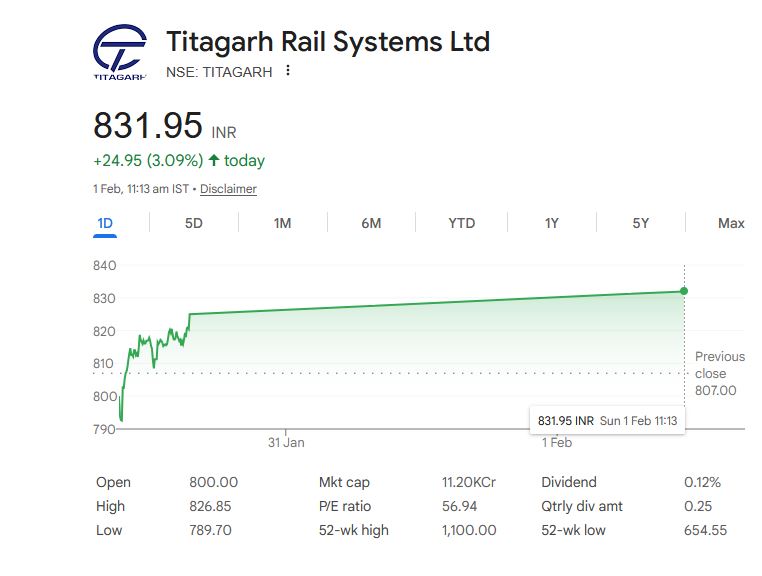 वहीं, टीटागढ़ रेल सिस्टम के शेयर 800 रुपये पर खुले और दिनभर के कारोबार में 831.95 रुपये के इंट्रा-डे हाई तक पहुंच गए। इस स्टॉक में एक हफ्ते में 6% से अधिक की तेजी देखी गई। दोनों कंपनियों पर बजट के सकारात्मक संकेत निवेशकों को आकर्षित कर रहे हैं।