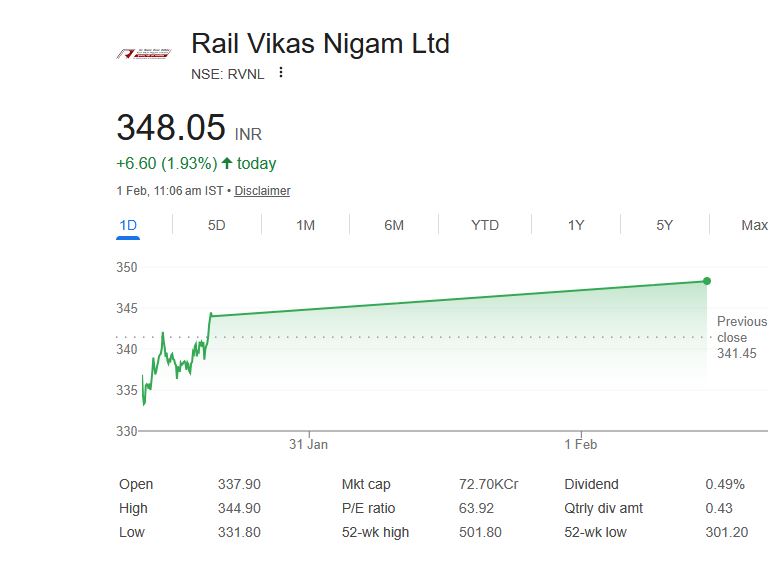दरअसल, रेल विकास निगम लिमिटेड (RVNL) का शेयर आज 1 फरवरी को 337.90 रुपये के स्तर पर खुला और दिन के कारोबार में यह 344.90 रुपये तक पहुंच गया, जो कि करीब 2% की तेजी दर्शाता है। बीते एक हफ्ते में इस कंपनी के शेयरों की कीमत में 7% की बढ़ोतरी हुई है। RVNL पर बजट से जुड़े प्रोजेक्ट्स और विकास योजनाओं की संभावना निवेशकों के लिए आकर्षक बनी हुई है।