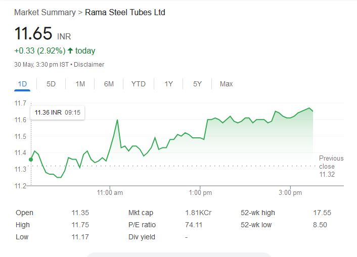 इस दौरान रामा स्टील ट्यूब्स लिमिटेड के शेयरों में अच्छी तेजी देखने को मिली। शु्क्रवार को रामा स्टील के शेयर शानदार 2.92% उछलकर 11.65 रुपये पर ट्रेड कर रहा था। ट्रेडिंग की शुरुआत 11.35 रुपये से हुई थी। दिनभर के कारोबार में शेयर ने 11.75 रुपये का हाई और 11.17 रुपये के लो लेवल को टच किया।