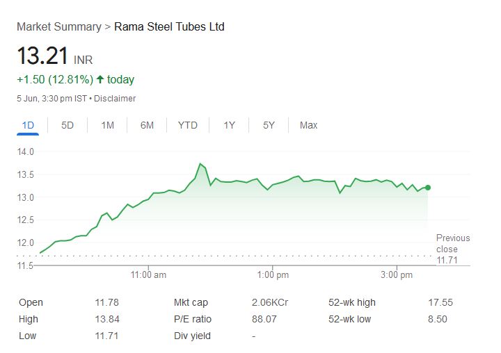- रामा स्टील ट्यूब्स का शेयर 5 महीने के हाई पर पहुंचा, 13.84 रुपये का इंट्राडे लेवल छुआ।