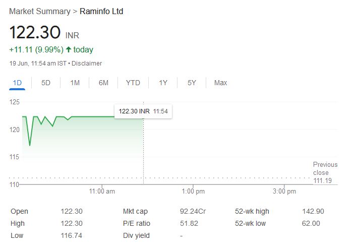 Raminfo Limited Share: छोटकू लेकिन तेजी से आगे बढ़ती कंपनी Raminfo Limited ने शेयर बाजार में खलबली मचा दी है। गुरुवार को कंपनी के स्टॉक्स बीएसई पर 10 फीसदी की तेजी के साथ 122.30 रुपये पर पहुंच गए। पिछले 5 कारोबारी सत्रों के दौरान Raminfo के शेयरों ने करीब 65% की तेजी दिखाई है। 13 जून 2025 को यह शेयर महज 74.19 रुपये पर था, जो 19 जून को 122 रुपये के पार चला गया।