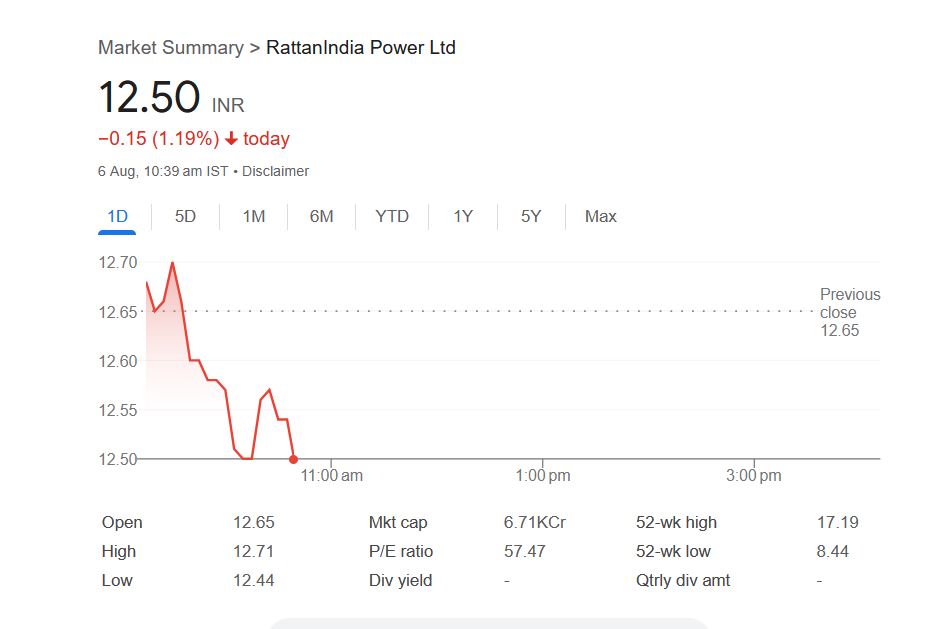 Rattanindia Power Share: बुधवार, 6 अगस्त 2025 के दिन सेंसेक्स-निफ्टी में उतार-चढ़ाव के बीच रतनइंडिया पावर लिमिटेड कंपनी का शेयर 12.50 रुपये पर कारोबार कर रहा हैं। पिछला क्लोजिंग प्राइस 12.65 रुपये के स्तर से शेयर -1.19% की गिरावट के साथ ट्रेड कर रहा हैं। आज सुबह स्टॉक मार्केट में ट्रेडिंग शुरू होते ही रतनइंडिया पावर शेयर 12.65 रुपये पर खुला था। जो आज सुबह 10.39 बजे तक रतनइंडिया पावर कंपनी शेयर ने 12.71 रुपये के इंट्रा-डे हाई को छुआ। वहीं, बुधवार को शेयर का लो-लेवल 12.44 रुपये रहा।