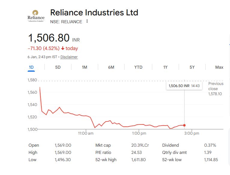कंपनी की इस सफाई के बाद भी बाजार को राहत नहीं मिली। मंगलवार को रिलायंस के शेयरों (RIL Share Price) में 5 फीसदी से ज्यादा की गिरावट दर्ज की गई। बीएसई पर शेयर 1,497 रुपये के निचले स्तर तक पहुंच गए। यह गिरावट 4 जून 2024, यानी लोकसभा चुनाव नतीजों वाले दिन के बाद से सबसे बड़ी गिरावट मानी जा रही है। रिलायंस निफ्टी 50 पर सबसे ज्यादा दबाव डालने वाला शेयर भी बन गया।