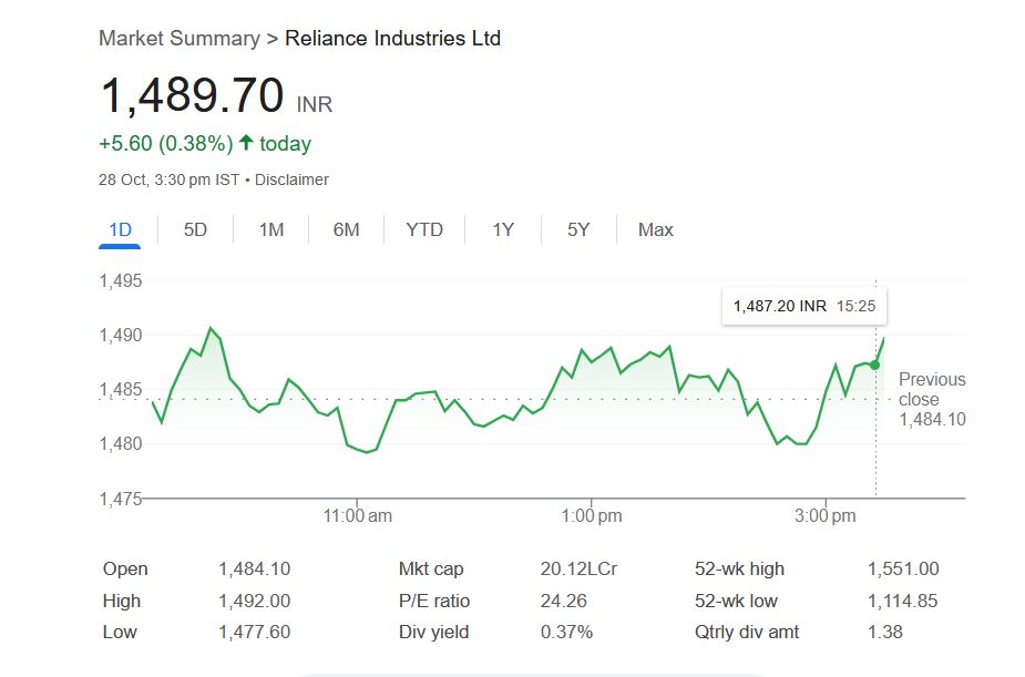 Reliance Industries Share Price: भारतीय शेयर बाजार में लिस्टेड सबसे बड़ी कंपनी रिलायंस इंडस्ट्रीज लिमिटेड (RIL) ने अपने ऑइल और टेलीकॉम व्यवसाय के साथ-साथ नए बिनेस सेगमेंट भी शुरू किए हैं। कंपनी के शेयर आज मंगलवार को 0.38% की तेजी के साथ 1,489.70 रुपए पर बंद हुआ। इस समय कंपनी का मार्केट कैप 20.12 लाख करोड़ रुपए है। पिछले एक माह में स्टॉक में लगभग 8% की तेजी देखी गई है। साथ ही, रिलायंस एआई इंफ्रास्ट्रक्चर में भी निवेश कर रही है, जिससे भविष्य में नई वृद्धि संभावनाएं बढ़ सकती हैं।