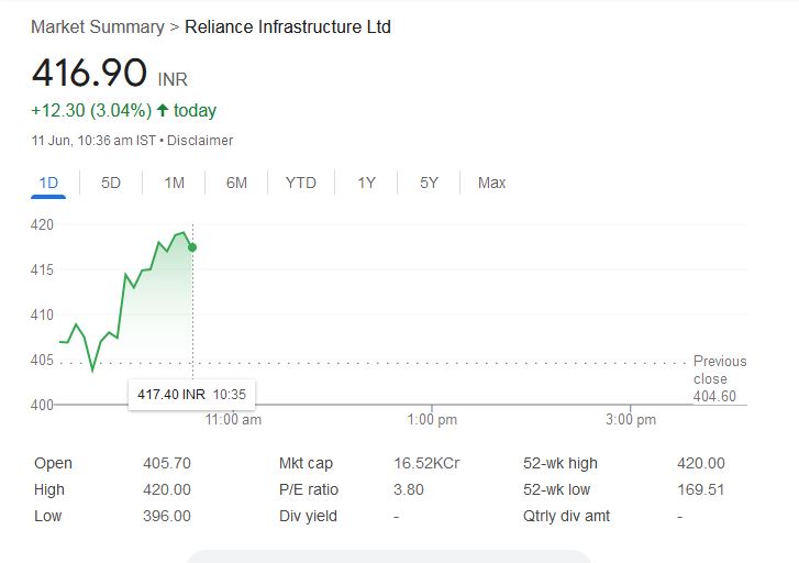 - रिलायंस इंफ्रास्ट्रक्चर के शेयर 420 रुपये के हाई तक पहुंचे।