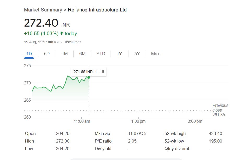 Reliance Power and Infra Share: आज रिलायंस इंफ्रास्ट्रक्चर के शेयर 4% से ज्यादा की तेजी के साथ के 272.40 रुपये से स्तर पर पहुंच गया। वहीं, रिलायंस पावर के शेयर 3% से अधिक की उछाल के साथ 44.60 रुपये पर कारोबार कर रहा हैं। इन दोनों कंपनियों के लिए बड़ी गुड न्यूज आई है और इसी कारण इनके शेयरों में तेजी देखने को मिली है।