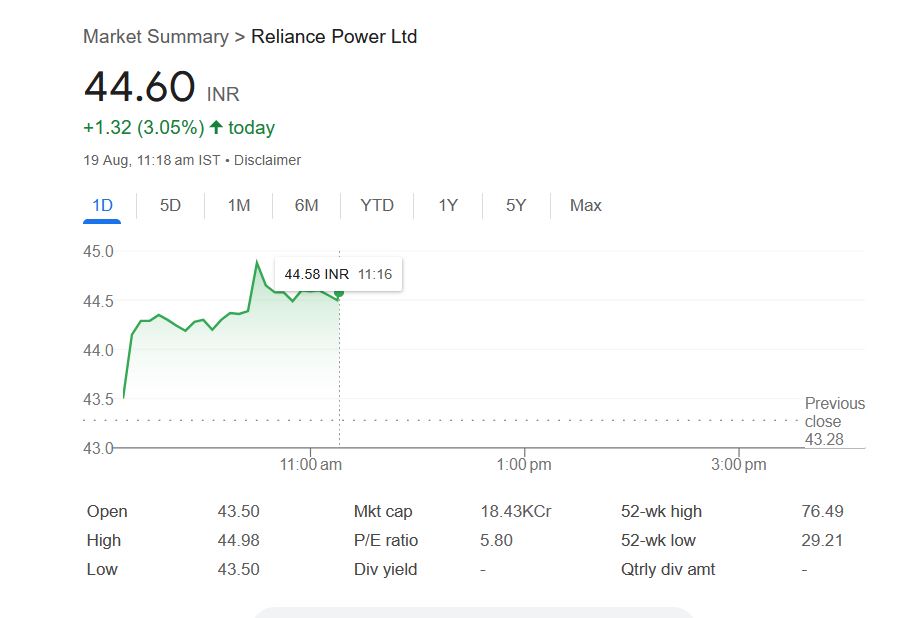 दरअसल, आज मंगलवार 19 अगस्त 2025 को अनिल अंबानी की कंपनी रिलायंस इंफ्रास्ट्रक्चर और रिलायंस पावर के स्टॉक्स में जबरदस्त उछाल देखने को मिल रही है। रिलायंस इंफ्रास्ट्रक्चर के शेयर मंगलवार को सुबह 11.18 बजे तक बीएसई में 4% से अधिक की छलांग लगाकर 272.40 रुपये के स्तर पर पहुंच गए हैं। जबकि, रिलायंस पावर के शेयर भी 3.05% की तेजी के साथ 44.60 रुपये पर कारोबार कर रहा है। अनिल अंबानी की इन दोनों कंपनियों के लिए बड़ी अच्छी खबर आई है और इसी वजह से इनके शेयरों में तूफानी तेजी देखने के मिल रही है। रिलायंस इंफ्रास्ट्रक्चर को एक दिग्गज नवरत्न कंपनी से बड़ा ऑर्डर मिला है।