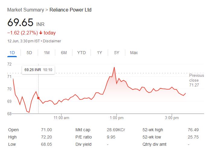 - रिलायंस पावर आज 69.65 रुपये पर 2.27% की गिरावट के साथ ट्रेड कर रहा है।