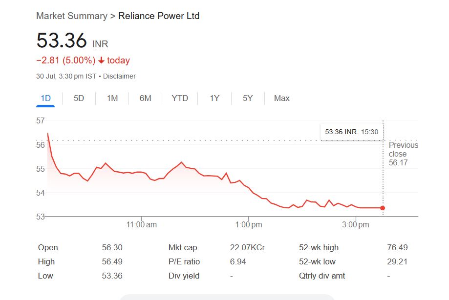 Reliance Power Share Price: आज बुधवार, 30 जुलाई 2025 को रिलायंस पावर लिमिटेड कंपनी के शेयर 5 प्रतिशत की भारी गिरावट के साथ 53.36 रुपये पर कारोबार कर रहा है। आज सुबह शेयर बाजार में ट्रेडिंग शुरू होते ही रिलायंस पावर शेयर 56.30 रुपये पर खुला था। आज दोपहर 3.30 बजे तक रिलायंस पावर कंपनी शेयर का इंट्रा डे हाई-लेवल 56.49 रुपये और लो-लेवल 53.36 रुपये था।
