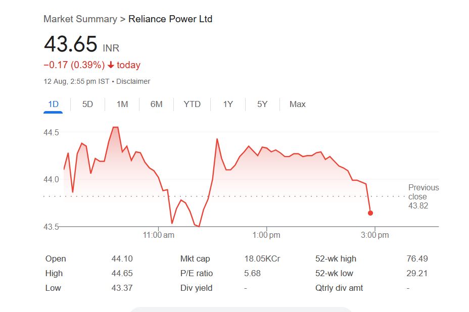 Reliance Power Share Price: आज मंगलवार, 12 अगस्त 2025 के दिन रिलायंस पावर लिमिटेड कंपनी का शेयर 0.39% फिसलकर 43.65 रुपये पर कारोबार कर रहा है। आज सुबह शेयर बाजार में ट्रेडिंग शुरू होते ही रिलायंस पावर शेयर 44.10 रुपये पर खुला था। जो आज दोपहर 2.55 बजे तक रिलायंस पावर कंपनी शेयर का इंट्रा-डे हाई-लेवल 44.65 रुपये और लो-लेवल 43.37 रुपये रहा।