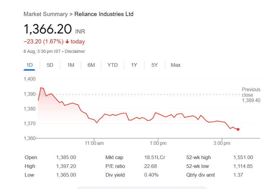 Reliance Share Price: शुक्रवार, 8 अगस्त 2025 के दिन सेंसेक्स-निफ्टी में उतार-चढ़ाव के बीच रिलायंस इंडस्ट्रीज लिमिटेड कंपनी का शेयर 1366.20 रुपये पर कारोबार कर रहा है। पिछला क्लोजिंग प्राइस 1389.40 रुपये के स्तर से शेयर -1.67% की गिरावट के साथ ट्रेड करते हुए बंद हुआ। शुक्रवार को सुबह स्टॉक मार्केट में ट्रेडिंग शुरू होते ही रिलायंस इंडस्ट्रीज शेयर 1385 रुपये पर खुला था। आज दोपहर तक रिलायंस इंडस्ट्रीज कंपनी के शेयर ने दिन के 1397.20 रुपये के इंट्रा-डे हाई लेवल को छुआ। वहीं, शुक्रवार को शेयर का लो-लेवल 1369.5 रुपये रहा।