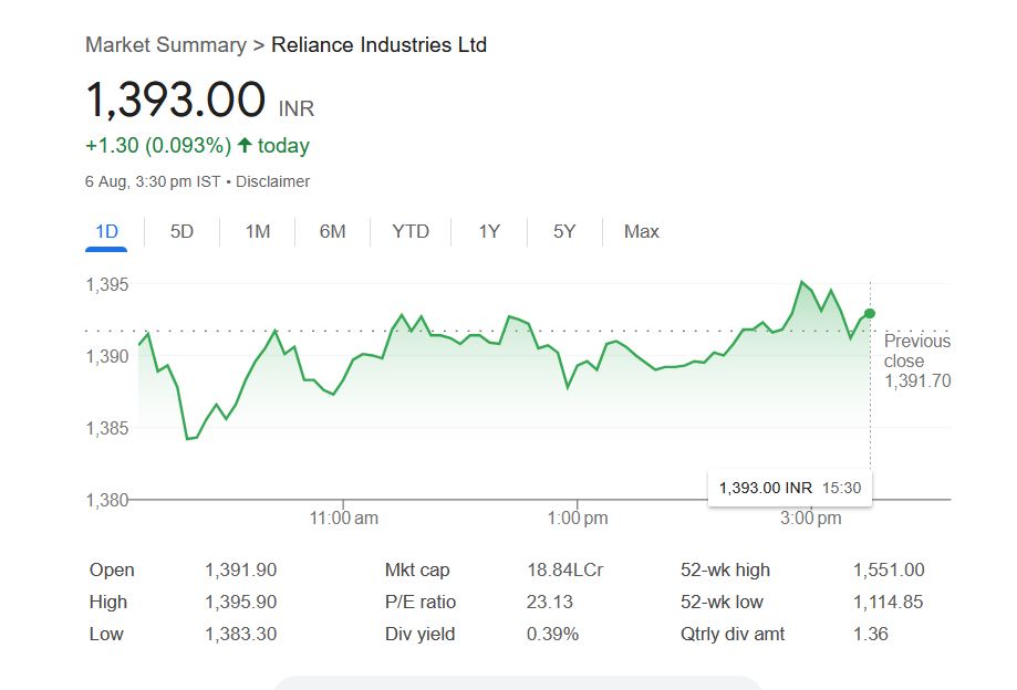 - रिलायंस का शेयर ₹1393 पर कारोबार कर रहा