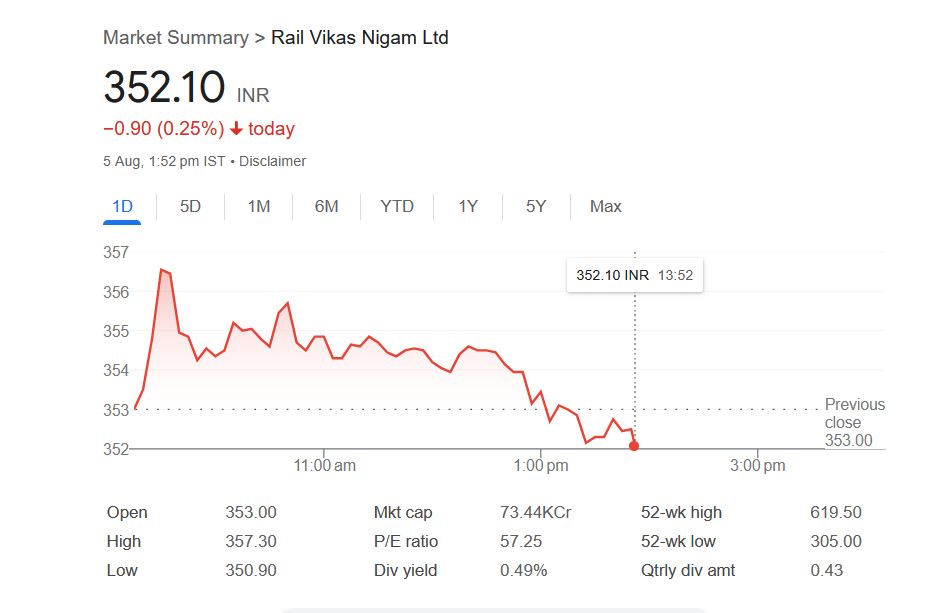 - RVNL का शेयर 0.25% गिरकर ₹352.10 पर पहुंचा