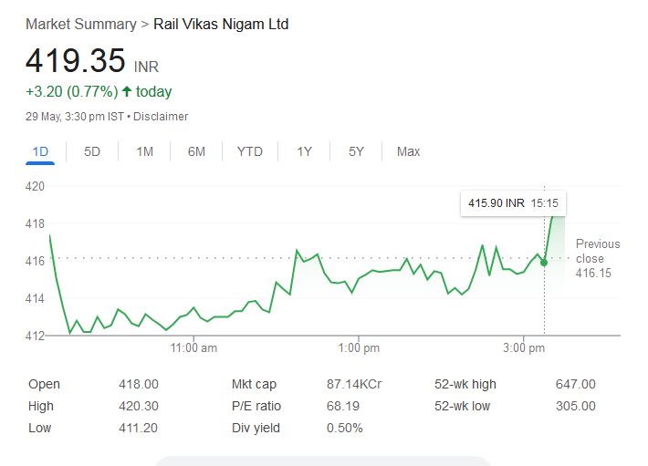 इस दौरान रेल विकास निगम लिमिटेड का शेयर 0.77% की मामूली बढ़त के साथ 419.35 रुपये पर कारोबार कर रहा था। RVNL शेयर की ओपनिंग 418 रुपये पर हुई थी और दोपहर 3:46 बजे तक यह 420.30 रुपये के हाई और 411.20 रुपये के लो तक गया।