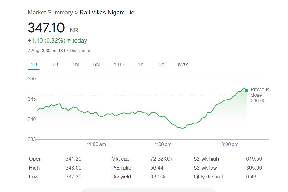 RVNL Share Price: गुरुवार, 7 अगस्त 2025 के दिन सेंसेक्स-निफ्टी में उठा-पटक के बीच रेल विकास निगम लिमिटेड कंपनी के शेयर 347.10 रुपये पर कारोबार कर रहा हैं। पिछला क्लोजिंग प्राइस 346 रुपये के स्तर से शेयर 0.32% की तेजी के साथ ट्रेड करते हुए बंद हुआ। गुरुवार को सुबह शेयर मार्केट में ट्रेडिंग शुरू होते ही रेल विकास निगम शेयर 341.20 रुपये पर ओपन हुआ था। जो आज दोपहर तक रेल विकास निगम कंपनी शेयर ने दिन का 348 रुपये के हाई लेवल को छुआ। वहीं, गुरुवार को शेयर का लो-लेवल 337.20 रुपये था।