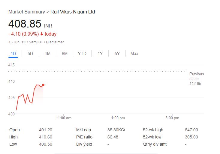 - RVNL शेयर आज -0.99% गिरकर 408.85 रुपये पर