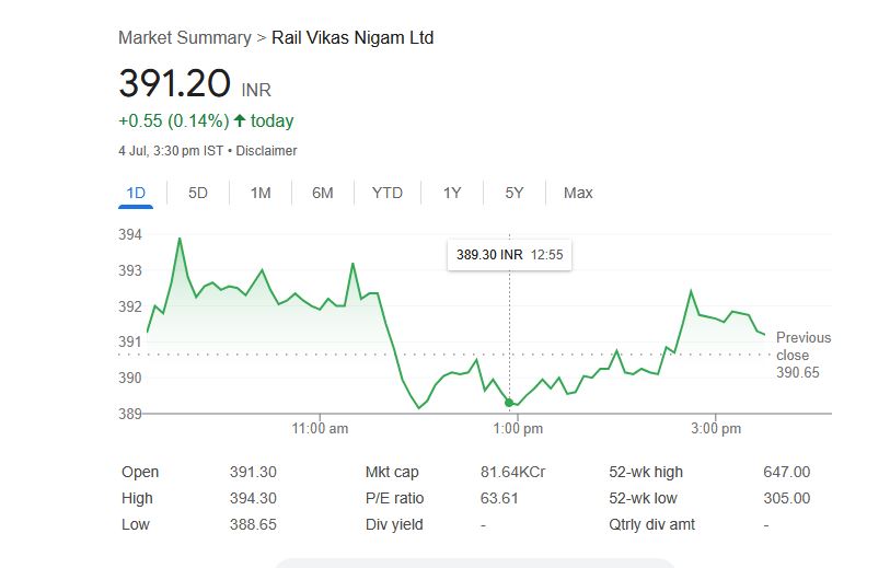 शुक्रवार को रेल विकास निगम लिमिटेड कंपनी के शेयर 391 से 393 रुपए के दायरे में कारोबार कर रहे थे। इस शेयर में 0.14% की हल्की बढ़ोतरी देखी गई थी। लेकिन अब तक यह स्टॉक 1890% तक का जबरदस्त रिटर्न दे चुका है, जो इसे निवेशकों के लिए बेहद आकर्षक बनाता है।