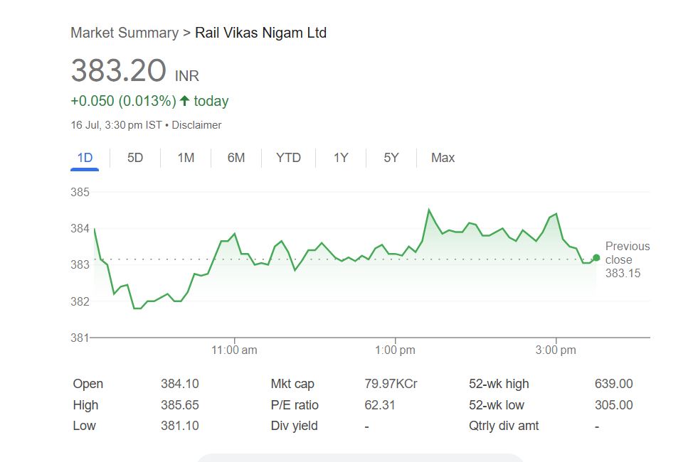 - RVNL का शेयर आज 383.20 रुपये पर हल्की तेजी के साथ ट्रेड कर रहा है।