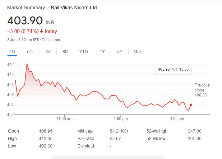 - RVNL का शेयर 0.74% गिरकर 403.90 रुपये पर बंद।