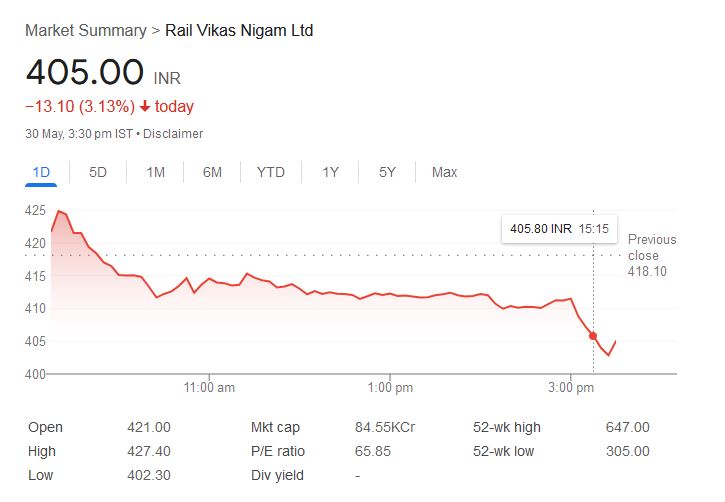 रेल विकास निगम लिमिटेड (RVNL) के शेयरों में भी शुक्रवार को गिरावट देखने को मिला। ट्रेडिंग की शुरुआत कंपनी के शेयर ने 421 रुपये पर की थी, लेकिन दिनभर उतार-चढ़ाव के बाद यह 3.13% गिरकर 405 रुपये पर बंद हुआ। कारोबार के दौरान यह शेयर दिन के उच्चतम स्तर 427.40 रुपये और न्यूनतम स्तर 402.30 रुपये तक पहुंचा।