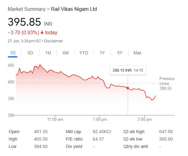 - RVNL शेयर शुक्रवार को गिरकर ₹395.85 पर बंद हुआ।