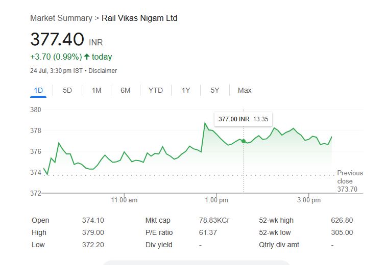 RVNL Share Price: आज, गुरुवार, 24 जुलाई 2025 के दिन रेल विकास निगम लिमिटेड (RVNL) कंपनी का शेयर 0.99% की छलांग लगाकर 377.40 रुपये पर कारोबार कर रहा है। आज सुबह शेयर बाजार में ट्रेडिंग शुरू होते ही रेल विकास निगम शेयर 374.10 रुपये पर ओपन हुआ था। जो आज दोपहर तक रेल विकास निगम कंपनी शेयर का इंट्रा डे हाई 379 रुपये और लो-लेवल 372.20 रुपये था।